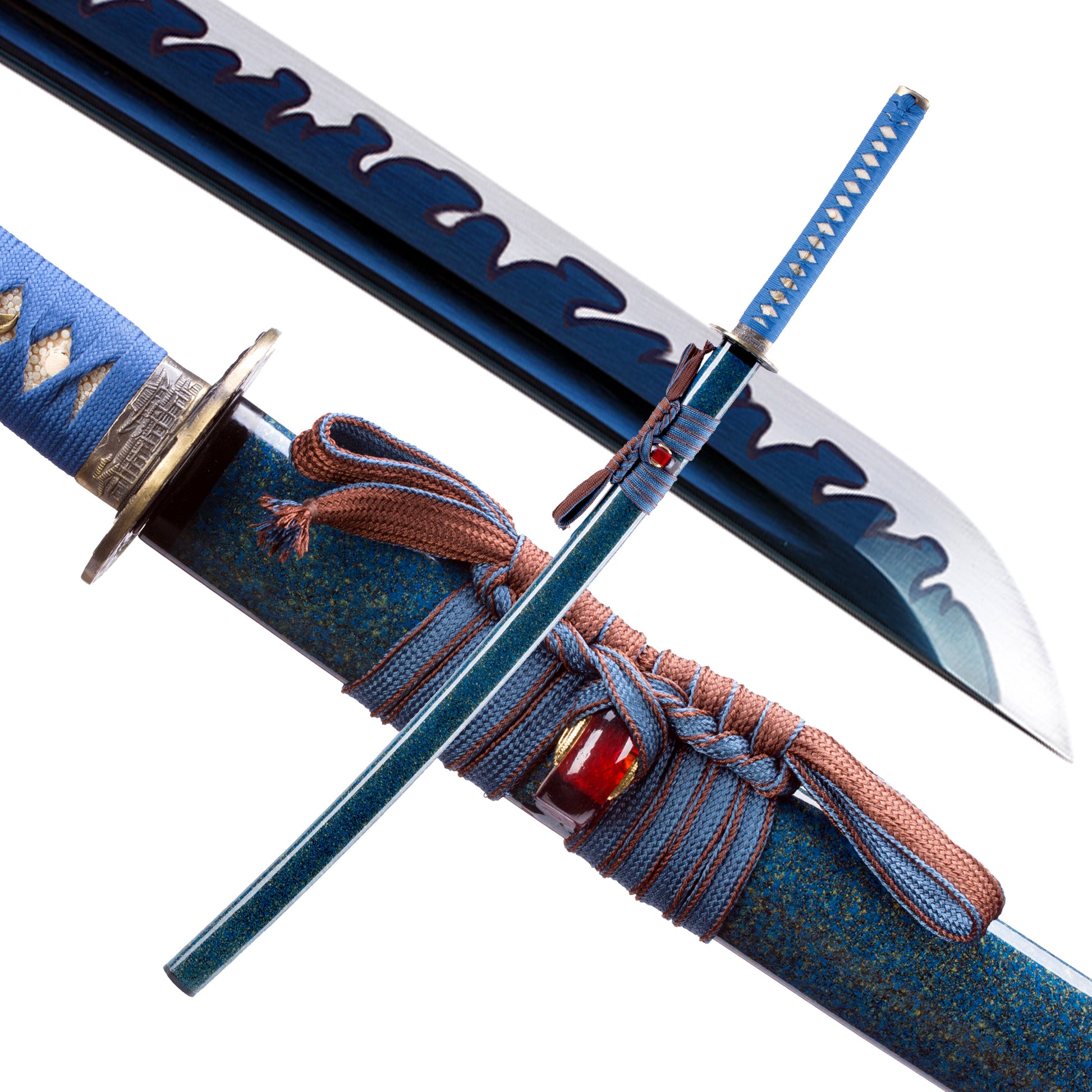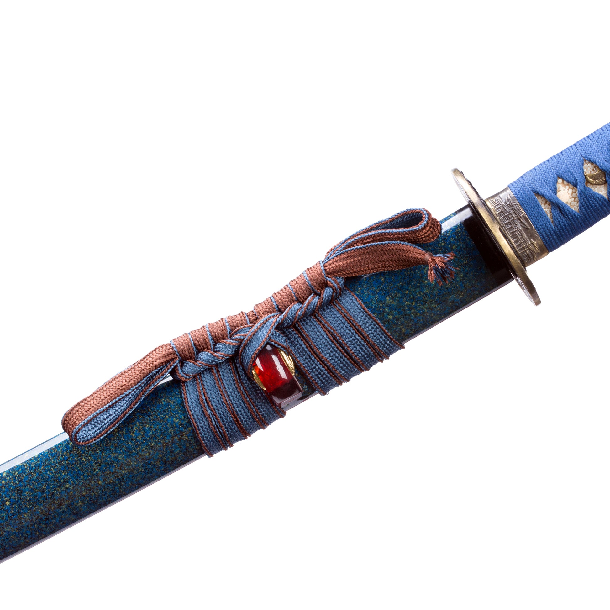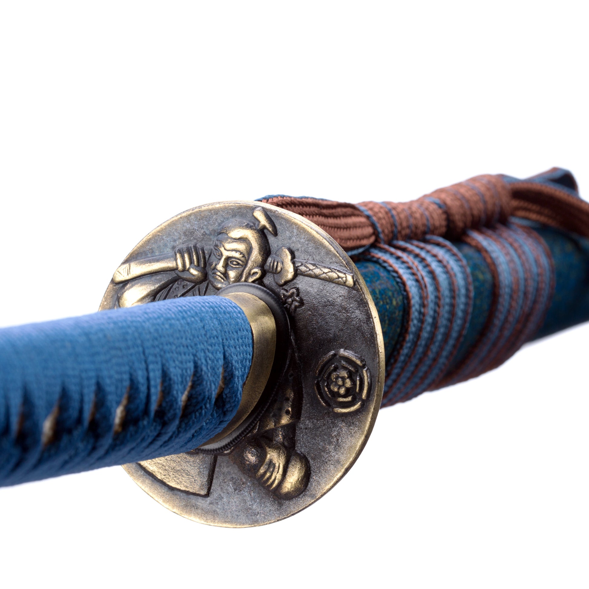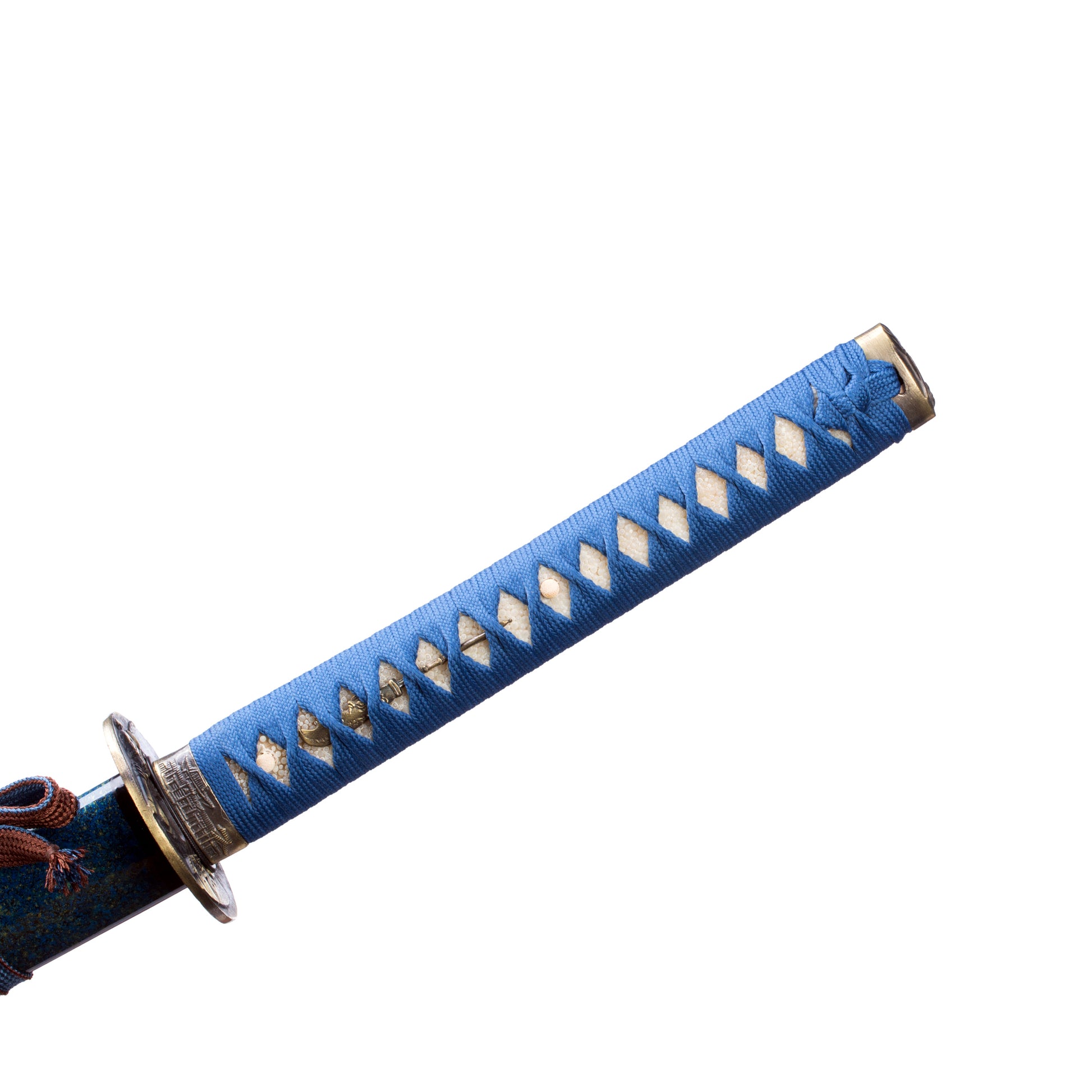- High Quality Handle(Tsuka):Tsuka is made of hardwood and real Skark Skin,matches with a weapon style Menuki,and wrapped with a blue rope using the Hinerimaki method.