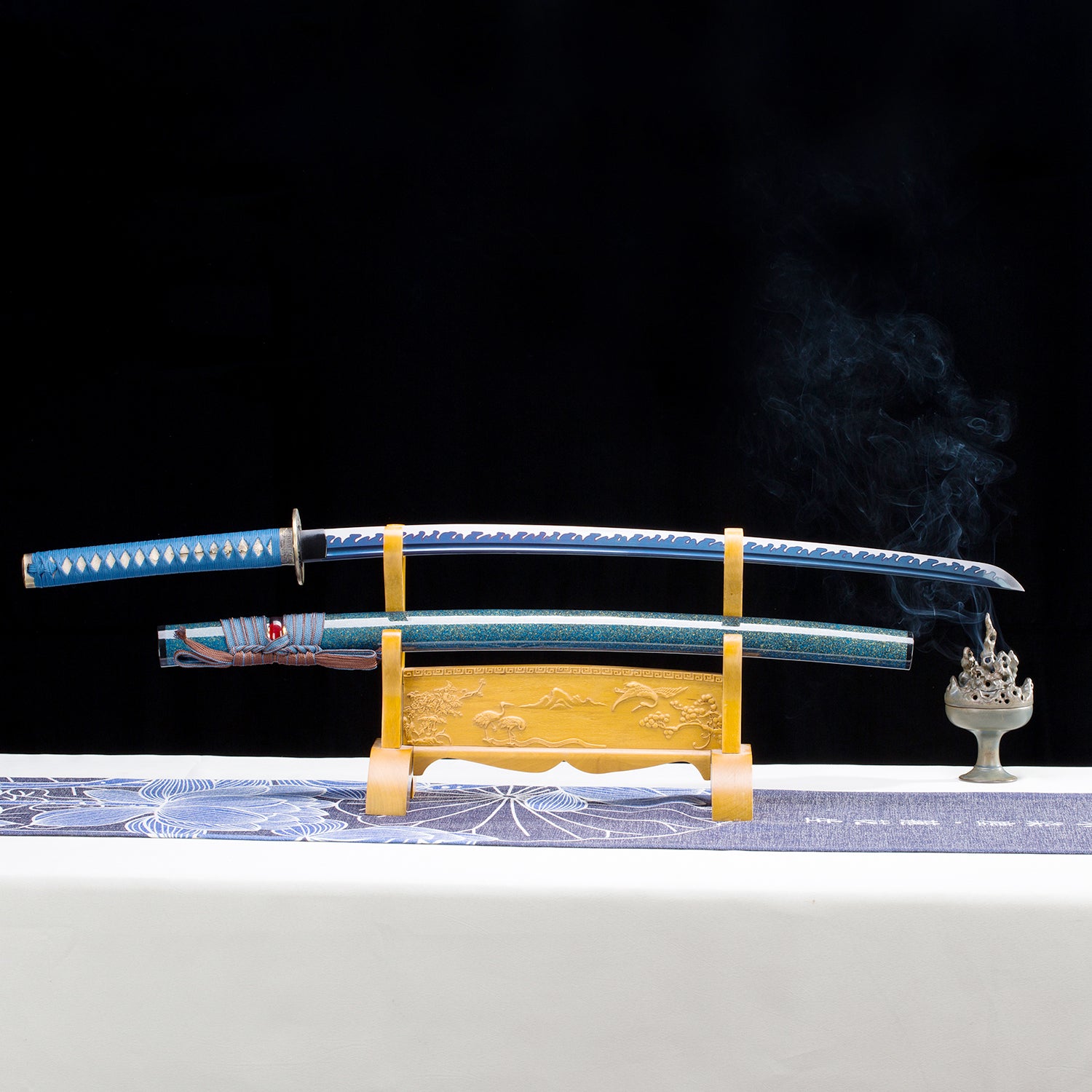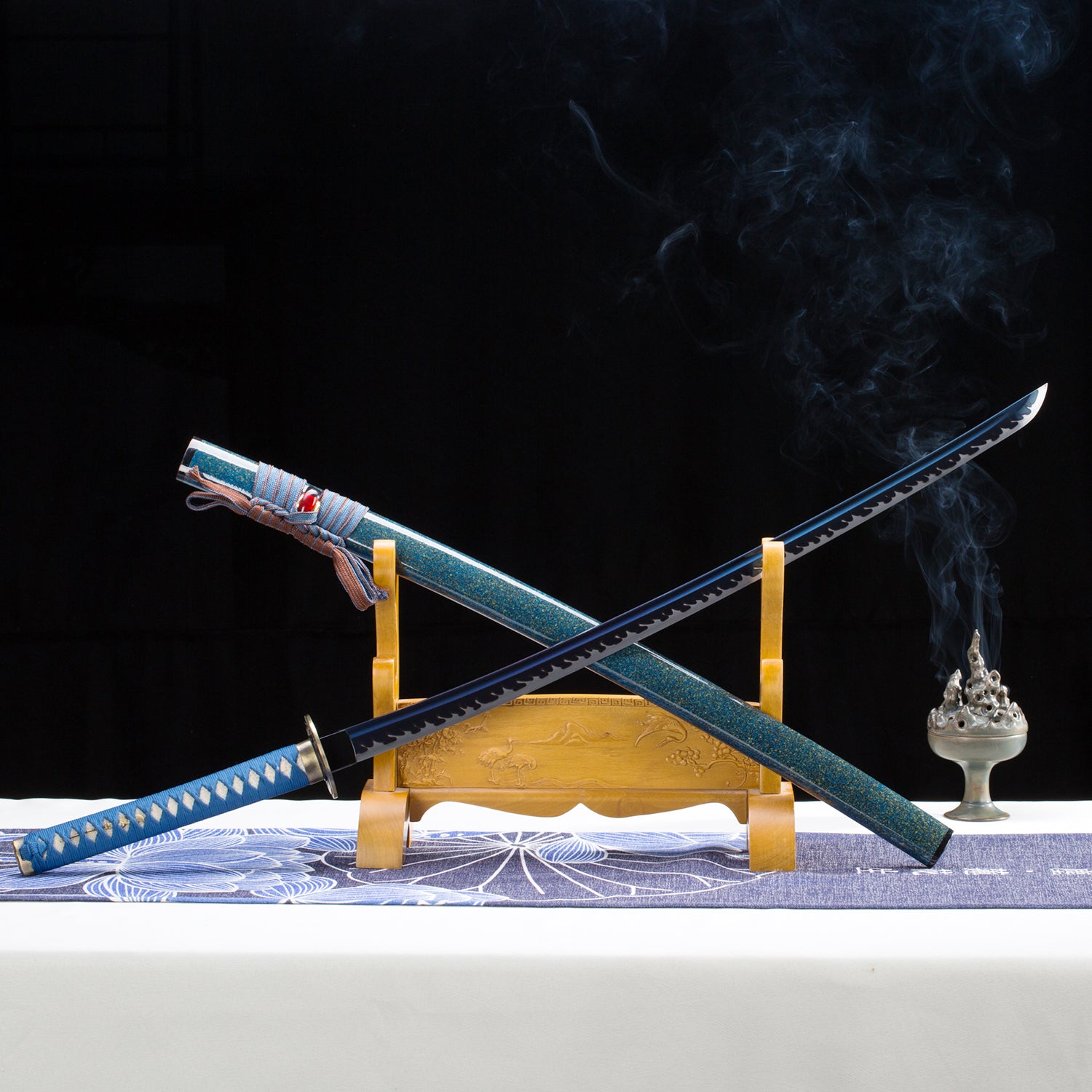 - Blue Theme Katana:The voerall katana is mainly bule,with bronze-colored alloy samurai-themed accessories,making the overall display of the katana very beautiful.