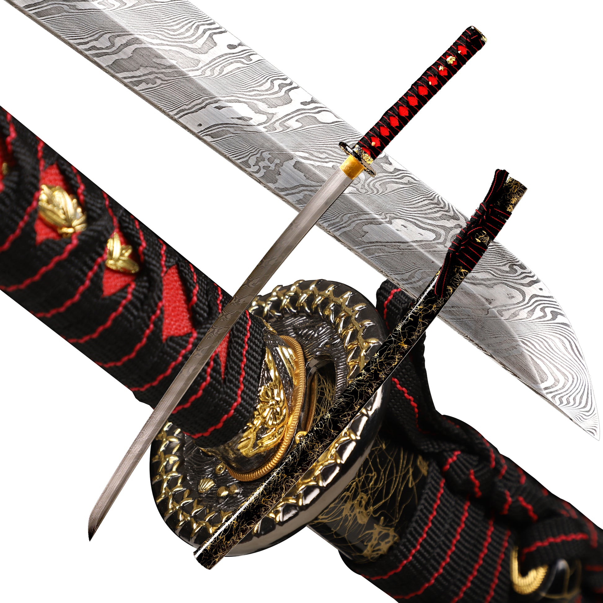 - Katanas Specifications:Blade Material:Damascus steel,It is 104 cm/40.94 inch in length, 27 cm/10.63 inch in handle length and 71 cm/27.95 inch in blade length.Blood Groove have,Sori 1.8 cm/0.71 inch,Color White Red,Package contains:1 katana,1 black rayon bag