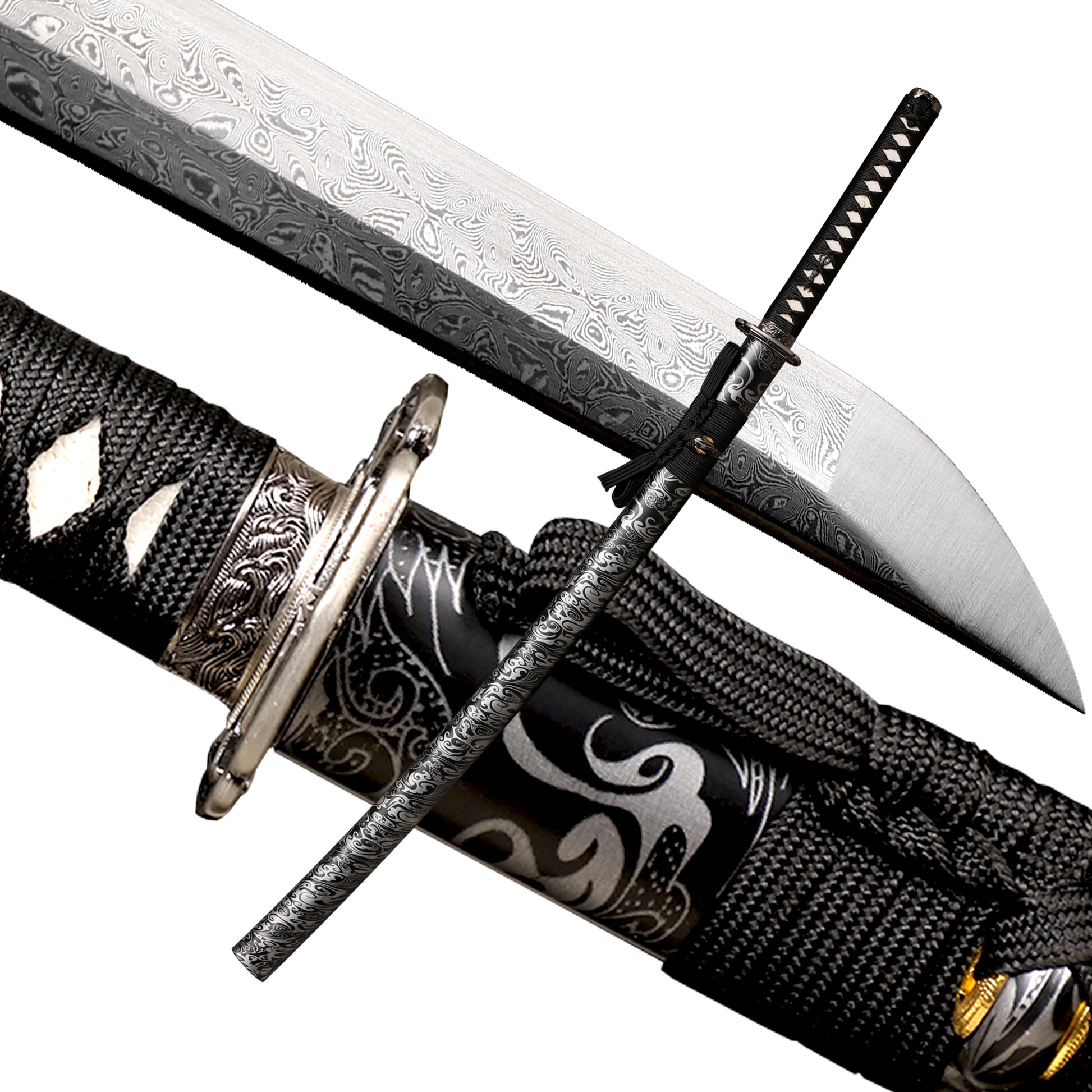 - Katanas Specifications:Blade Material:Damascus steel,It is 104 cm/40.94 inch in length, 27 cm/10.63 inch in handle length and 71 cm/27.95 inch in blade length.Blood Groove have,Sori 1.8 cm/0.71 inch,Color White Red,Package contains:1 katana,1 black rayon bag