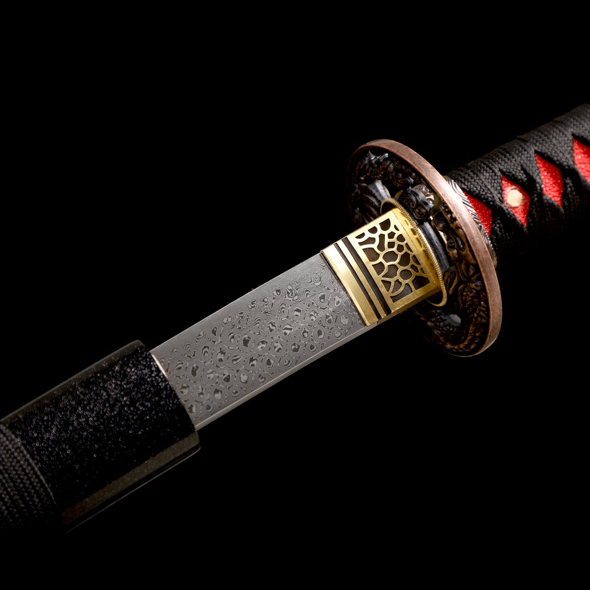 Scale DAMASCUS KATANA:The blade is made of 1095+15N20 steel by forging, and then undergoes quenching and tempered process,ensure the hardness and toughness of the blade while having distinctive patterns.