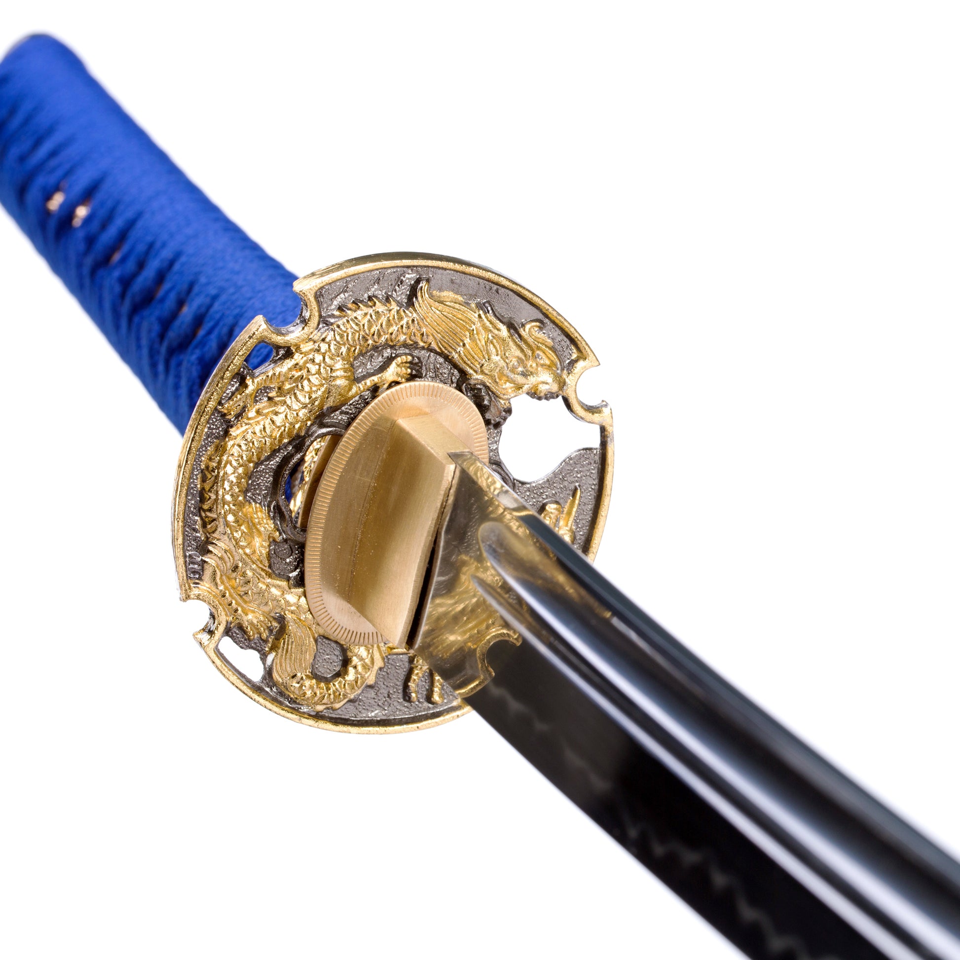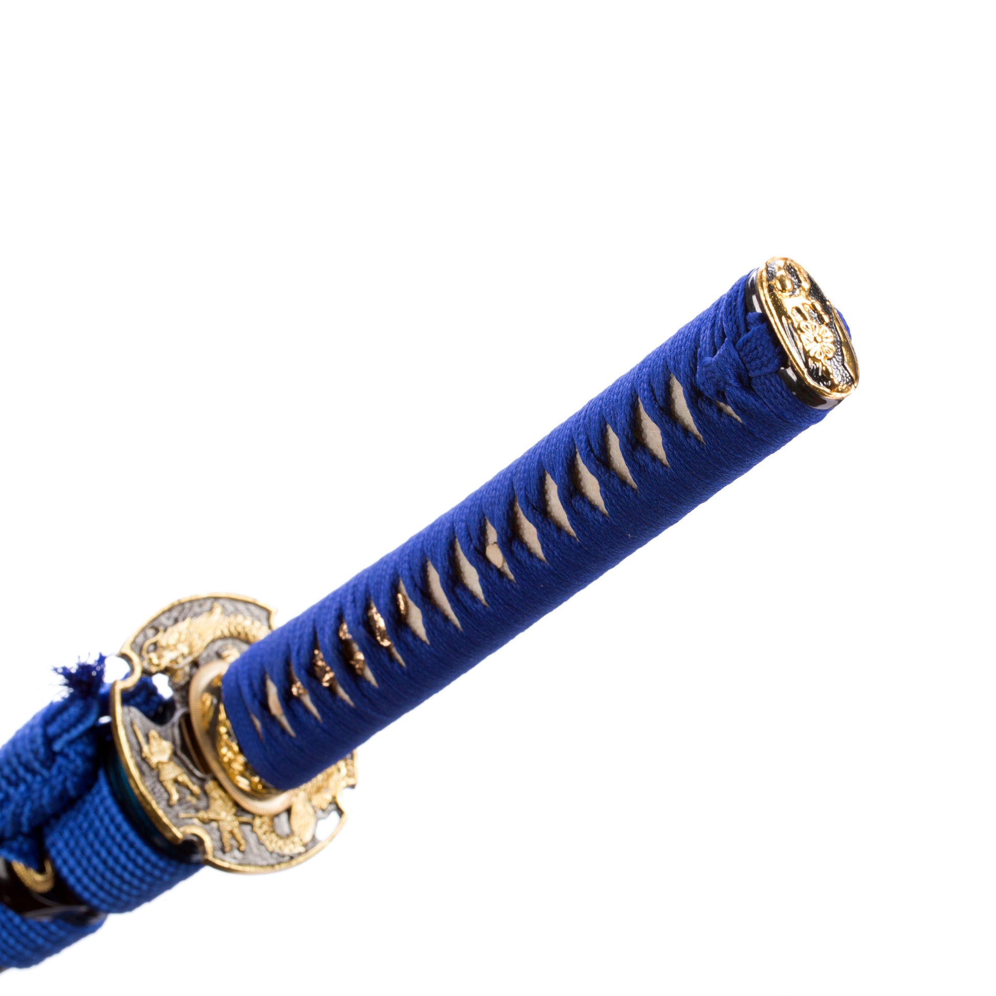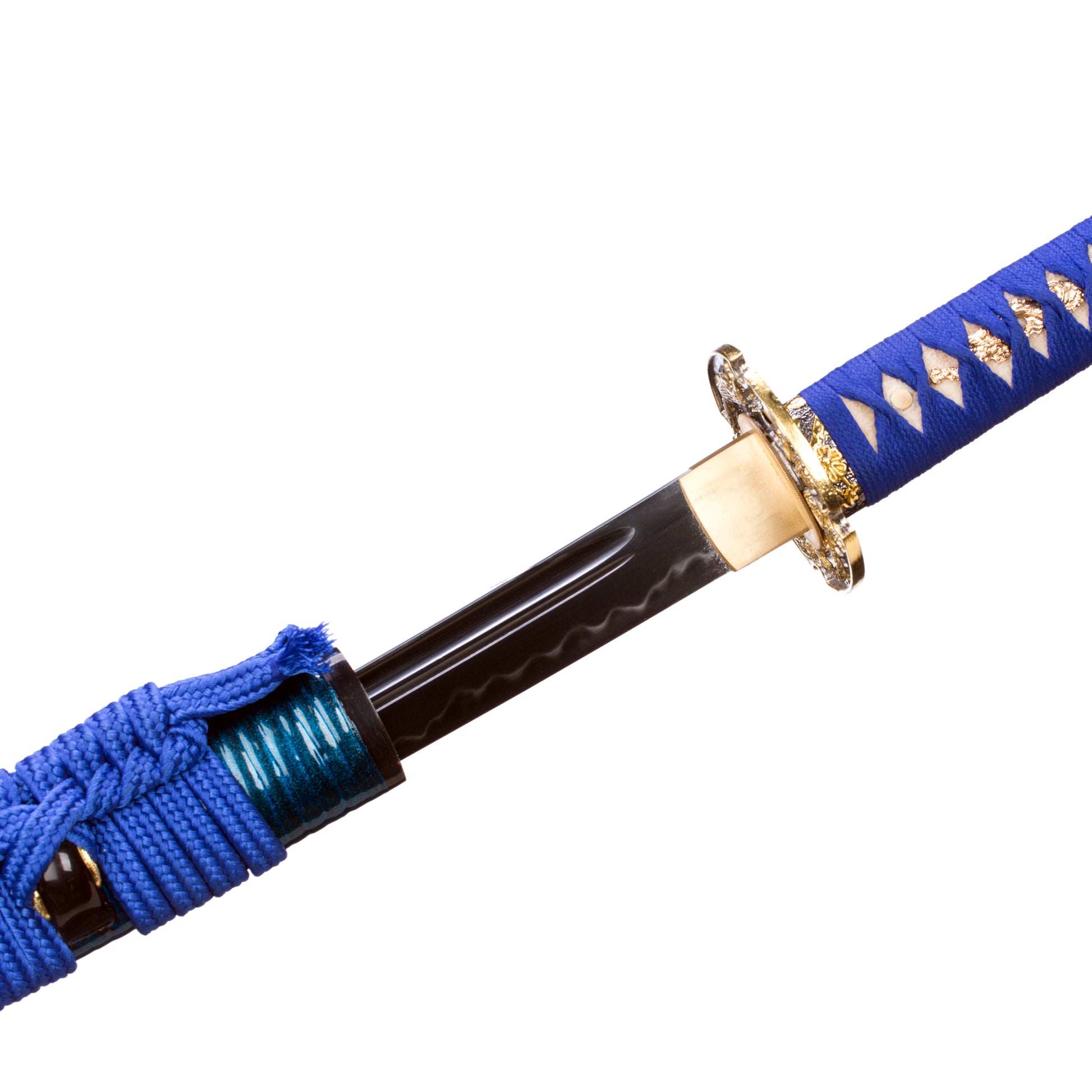 - Kogarasu Maru Golden Dragon Blue Theme:The katana is Kogarasu Maru 1095 clay tempered to produce natural hamon with a golden dragon Tsuba blue theme Japanese samurai sword.