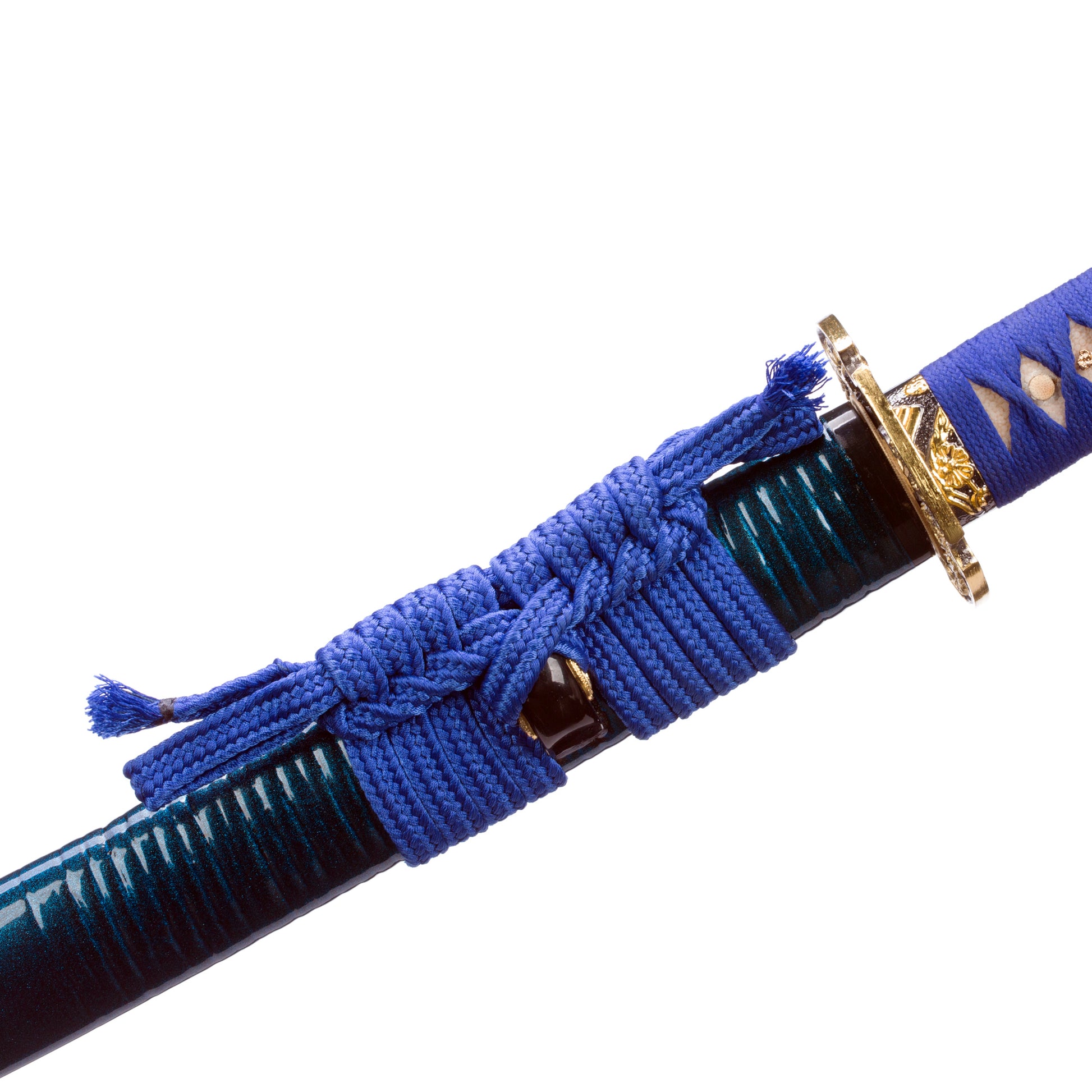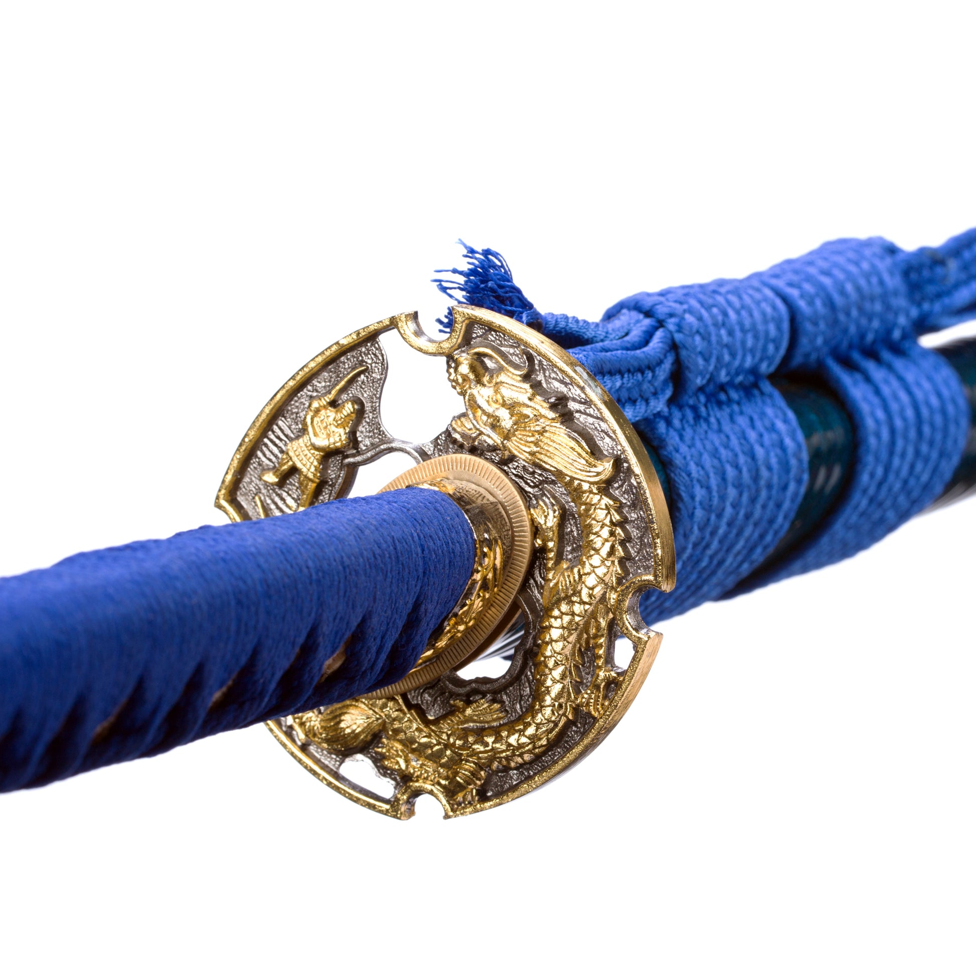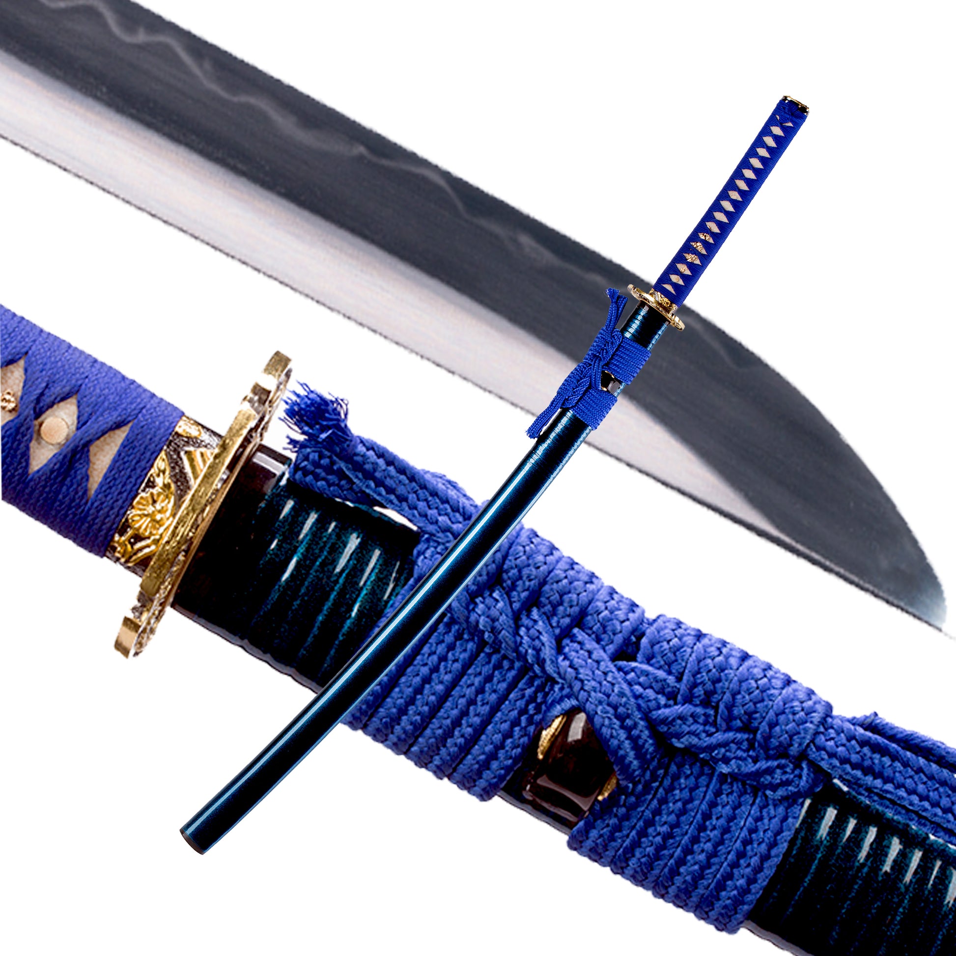 - Kogarasu Maru Golden Dragon Blue Theme:The katana is Kogarasu Maru 1095 clay tempered to produce natural hamon with a golden dragon Tsuba blue theme Japanese samurai sword.