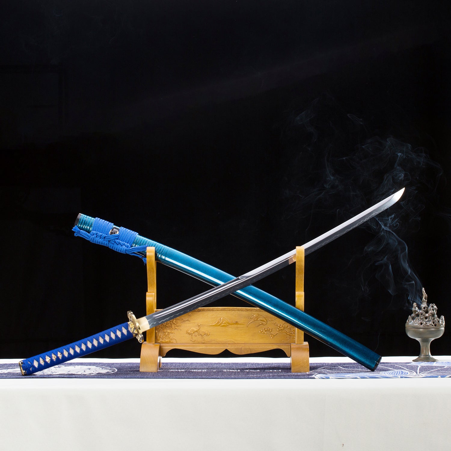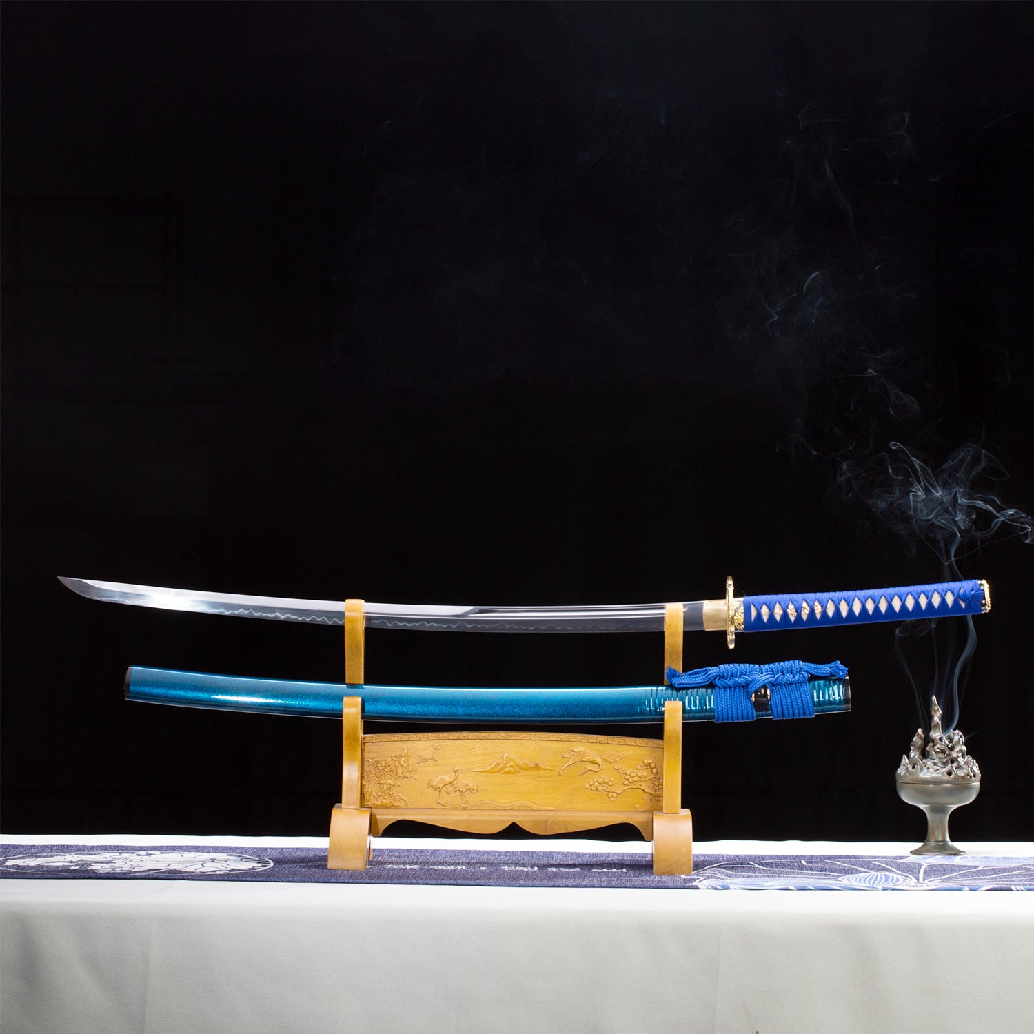 - High Quality Carving Saya:Saya is made of high-quality hardwood. The upper part is wrapped with rattan, and then sprayed with environmentally friendly water paint. The whole Saya is blue with a fluorescent dot effect.