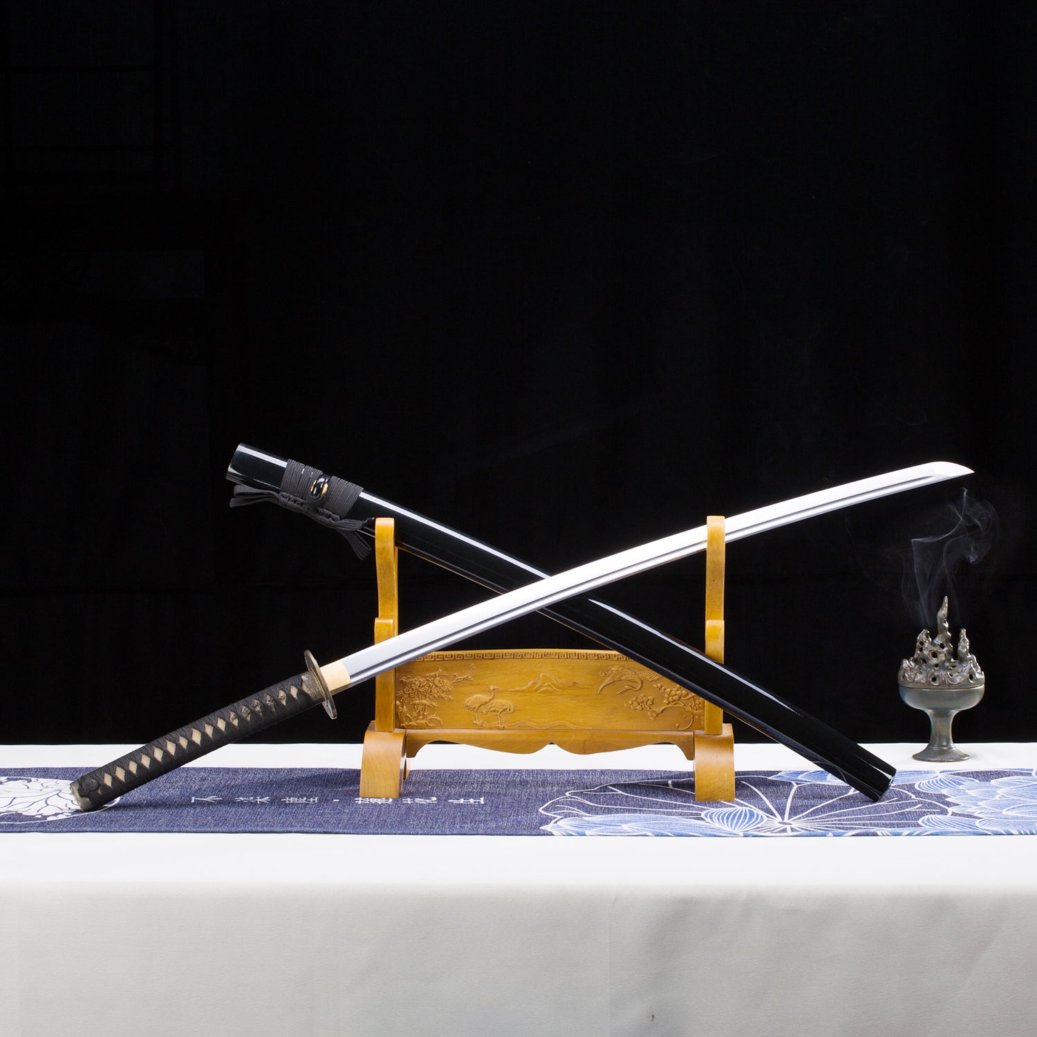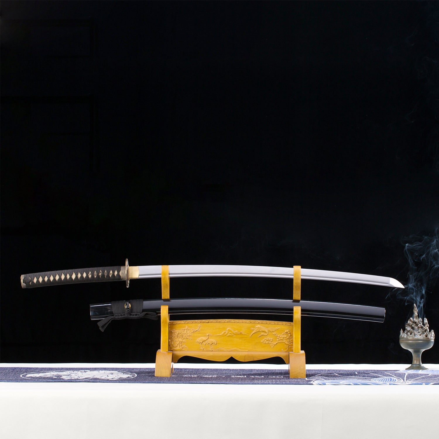- 1060 Steel Oil Quenching High Toughness Blade:The katana blade is made of 1060 steel oil quenched and forged.It has very good toughness.It has no effect on the samurai sword when bent at 70 degress. It will not break when bent at 140 degrees.The blade has Bohi and the blade hardness can reach 54-56HRC.