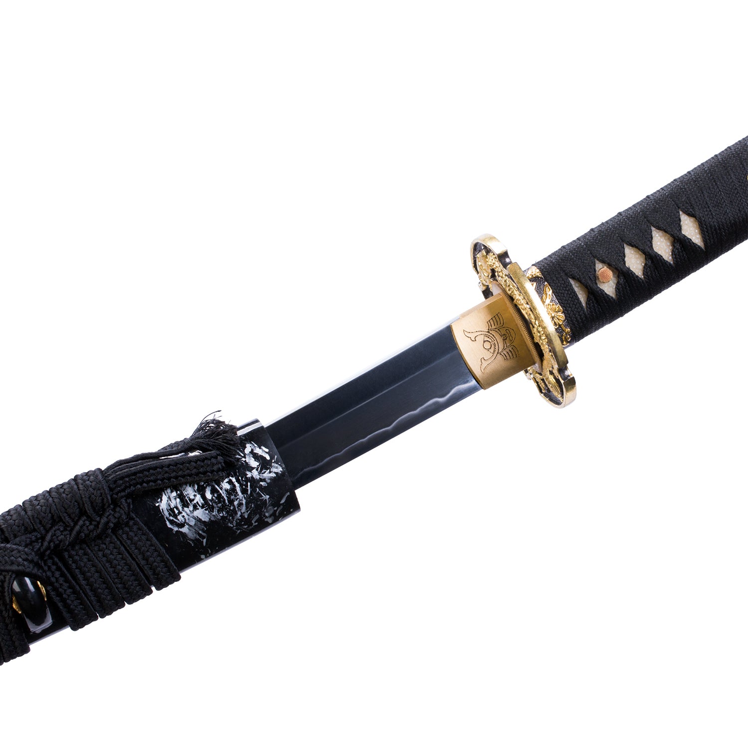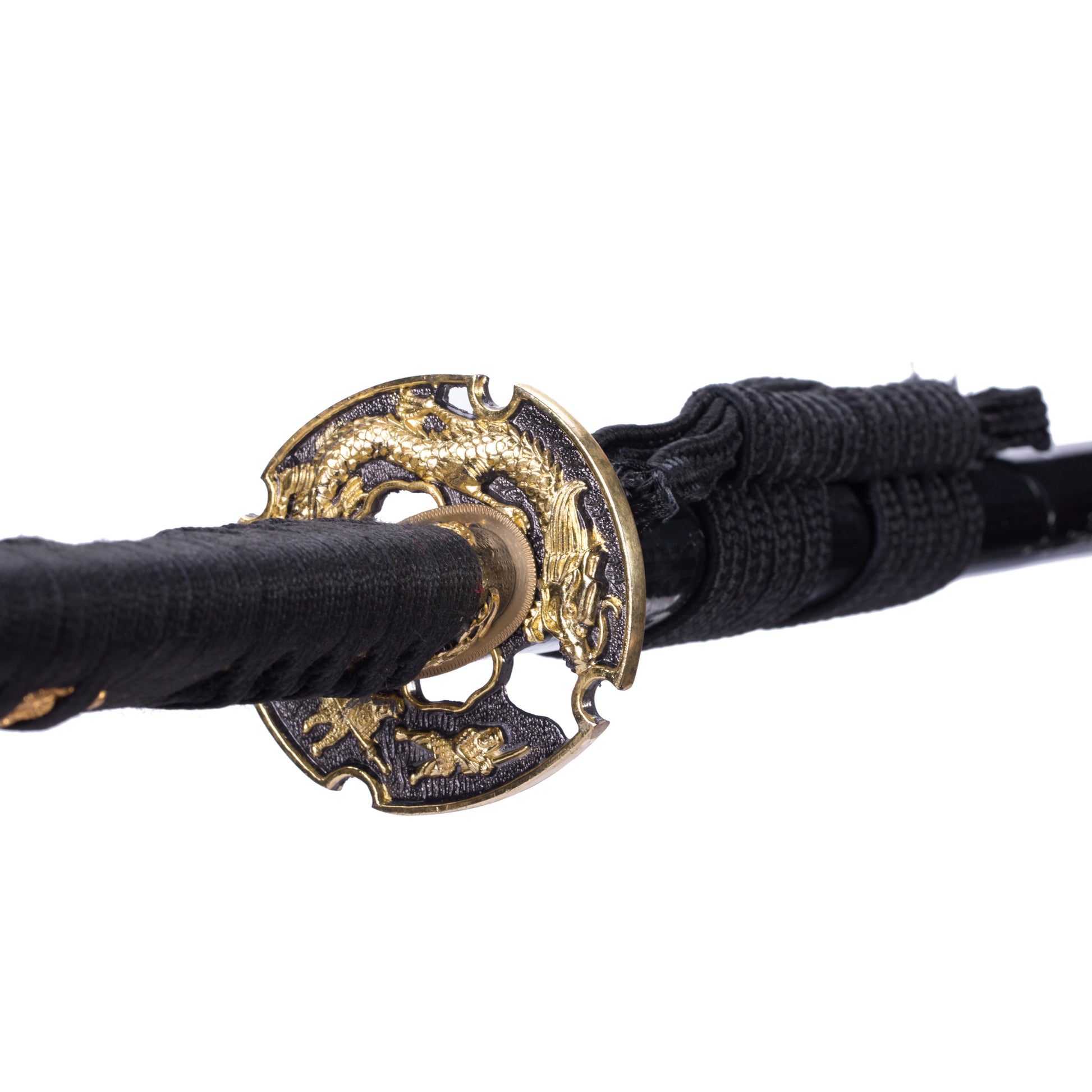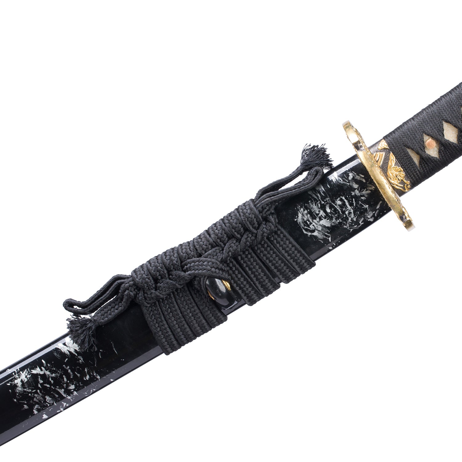 - Black Theme Katana:The overall katana is mainly black, with the golden Chinese dragon Tusba, and the black Saya decorated with white fireworks.