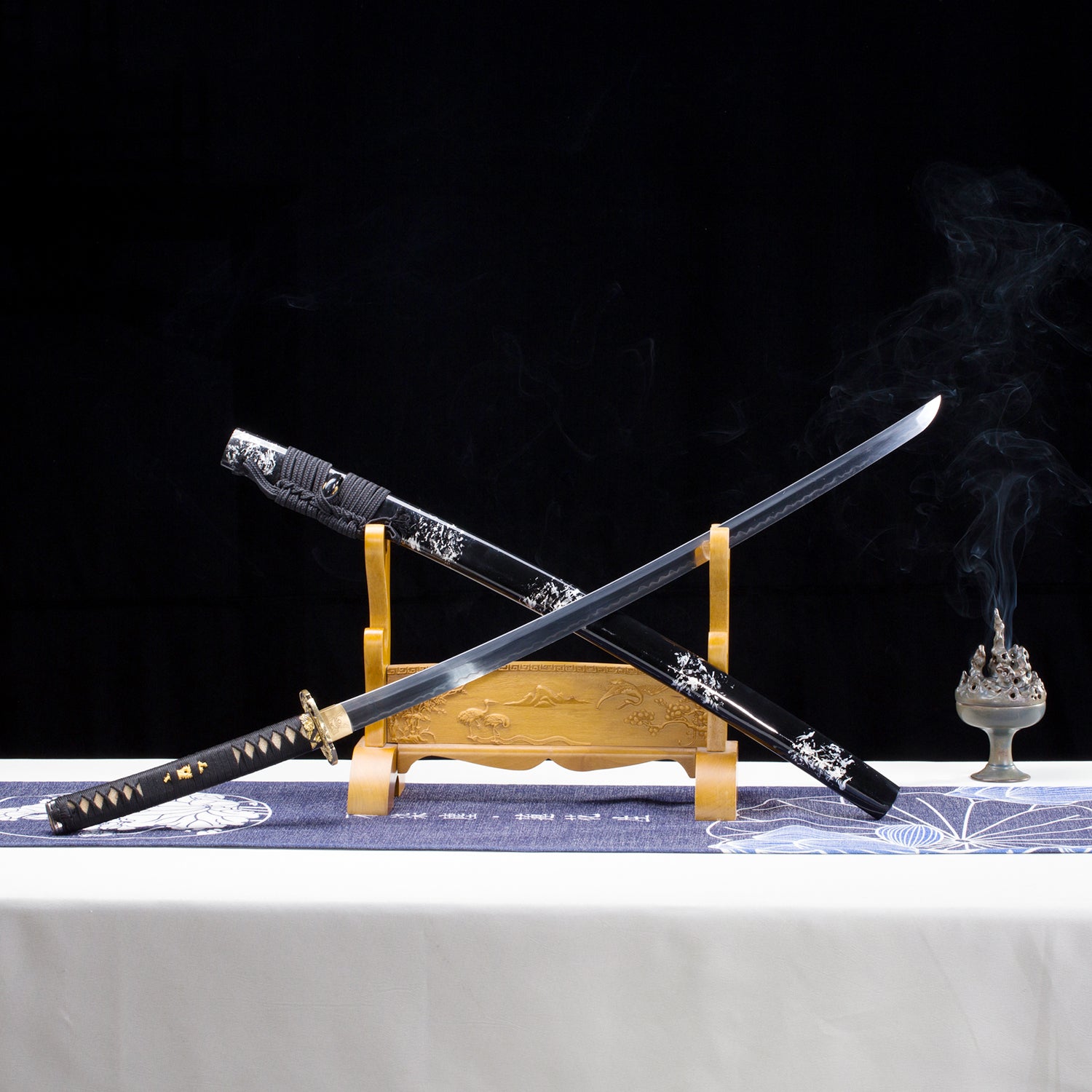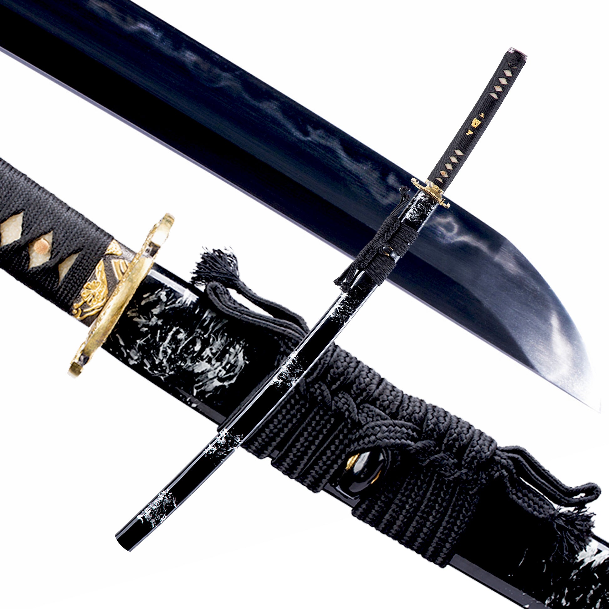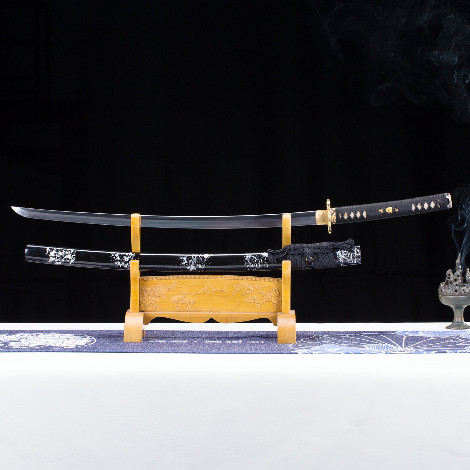 - Black Theme Katana:The overall katana is mainly black, with the golden Chinese dragon Tusba, and the black Saya decorated with white fireworks.